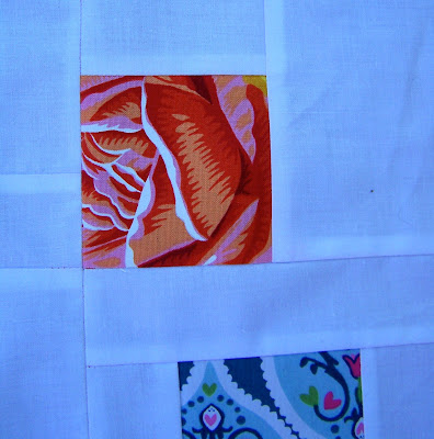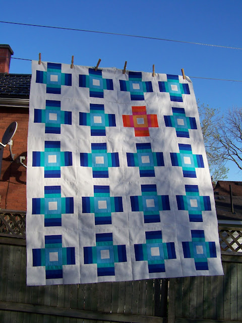 When I got one row together I thought awesome. Two rows together " this is going to be the best quilt ever". Three rows together "Oh, oh this kid is going to get eyestrain looking at this quilt". Thankfully row four contained the orange block and I could breathe easy again. I've been toying with the idea of adding more orange blocks to the quilt but maybe I'll just bind it with orange. What do you think?