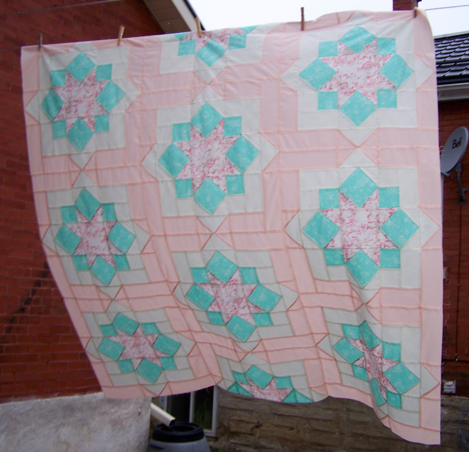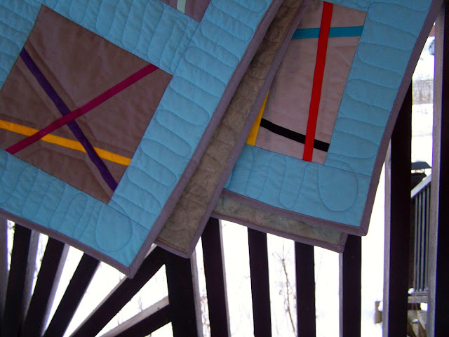 I finished the quilting on the Pick Up Sticks quilt around noon on Friday. As it was sunny out when I got the trimming done I hauled the quilt outside to the backyard to take some pictures. It's been so cloudy this winter that I thought I should take the pictures while I could.