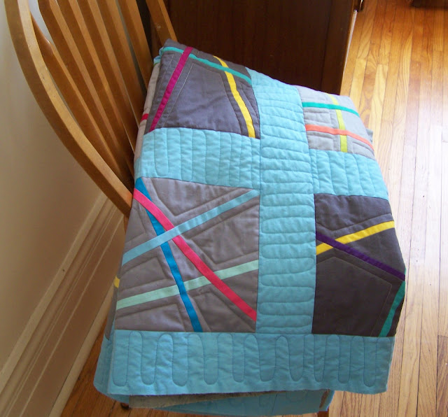 According to my daughter she's been waiting for me to quilt this for her for three years. This could be true. The pattern by Alexandra Ledgerwood is from the Spring 2012 Stitch Magazine. The original quilt had amazing feathered quilting on it and I was pretty intimidated by the thought of quilting it, so it's been sitting in the WIP pile for a while.