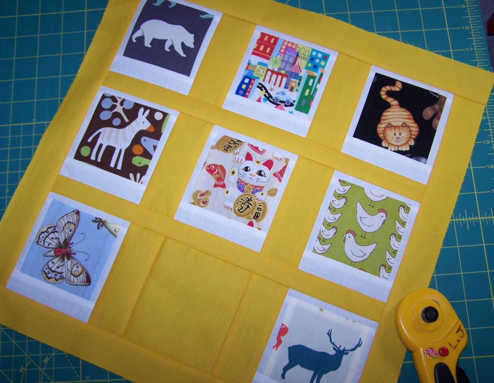 The photo part of the polaroid finishes at 3 inches and they are joined together by bright yellow sashing to make a