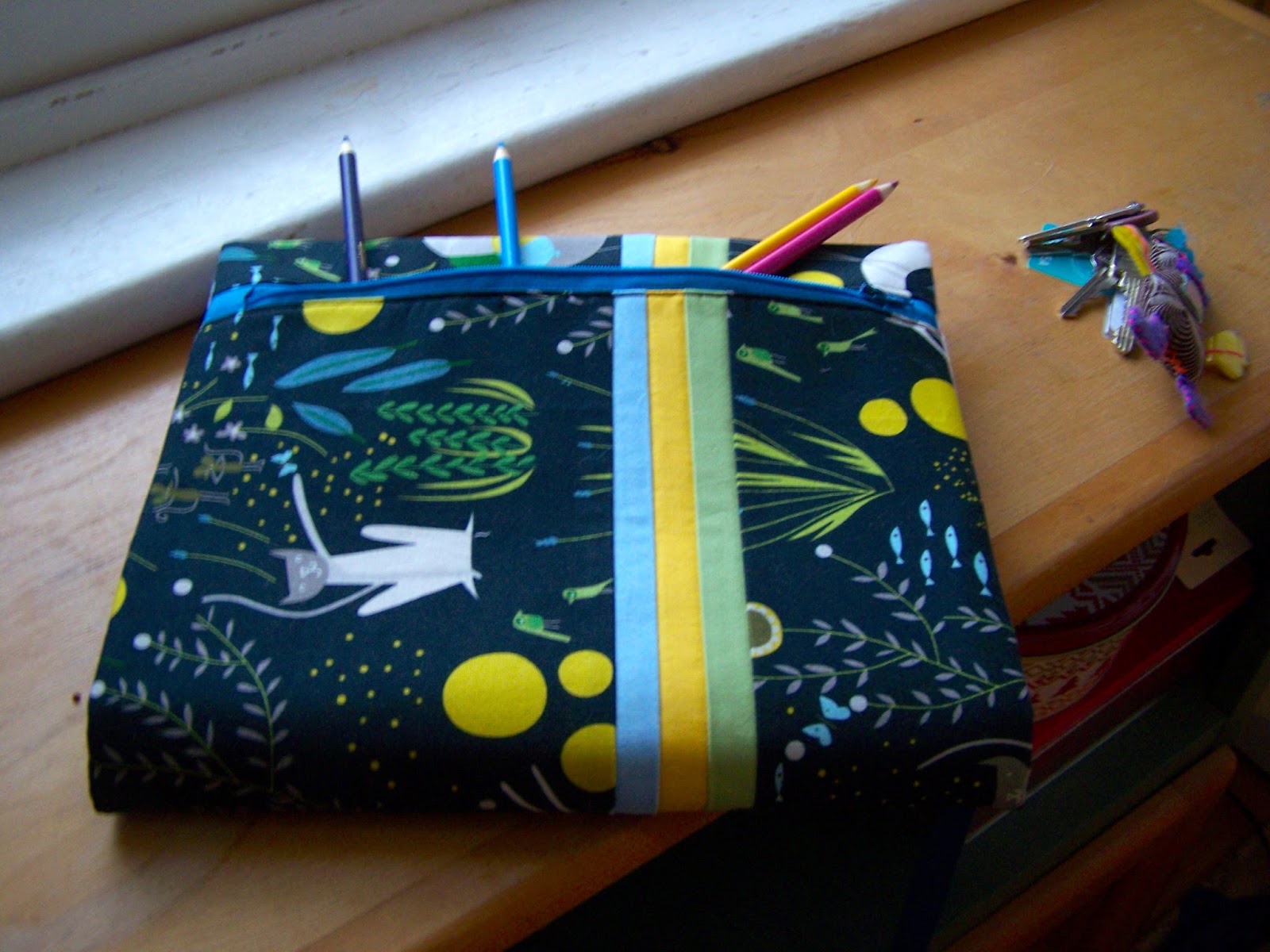 I picked up some of the colours in the print and added a striped border to the cover. I put a pocket on the inside cover with co-ordinating mouse fabric and added a polka dot