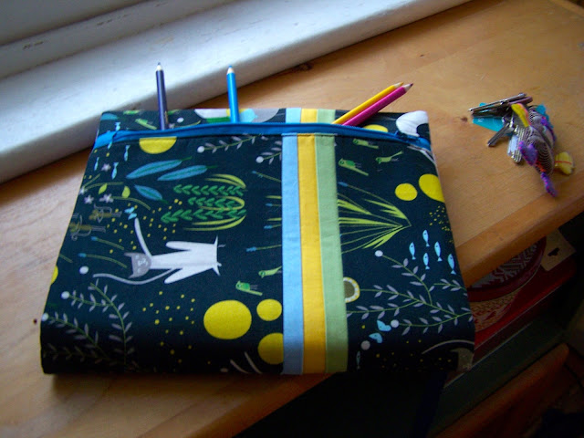 I followed the instructions in the Zippy Cover Tutorial from Amanda at What the Bobbin, but I made a slightly more basic version. I used Cat Dream by Lizzy House in black for the main fabric in my version. I love this fabric with it's whimsical cats and plants.