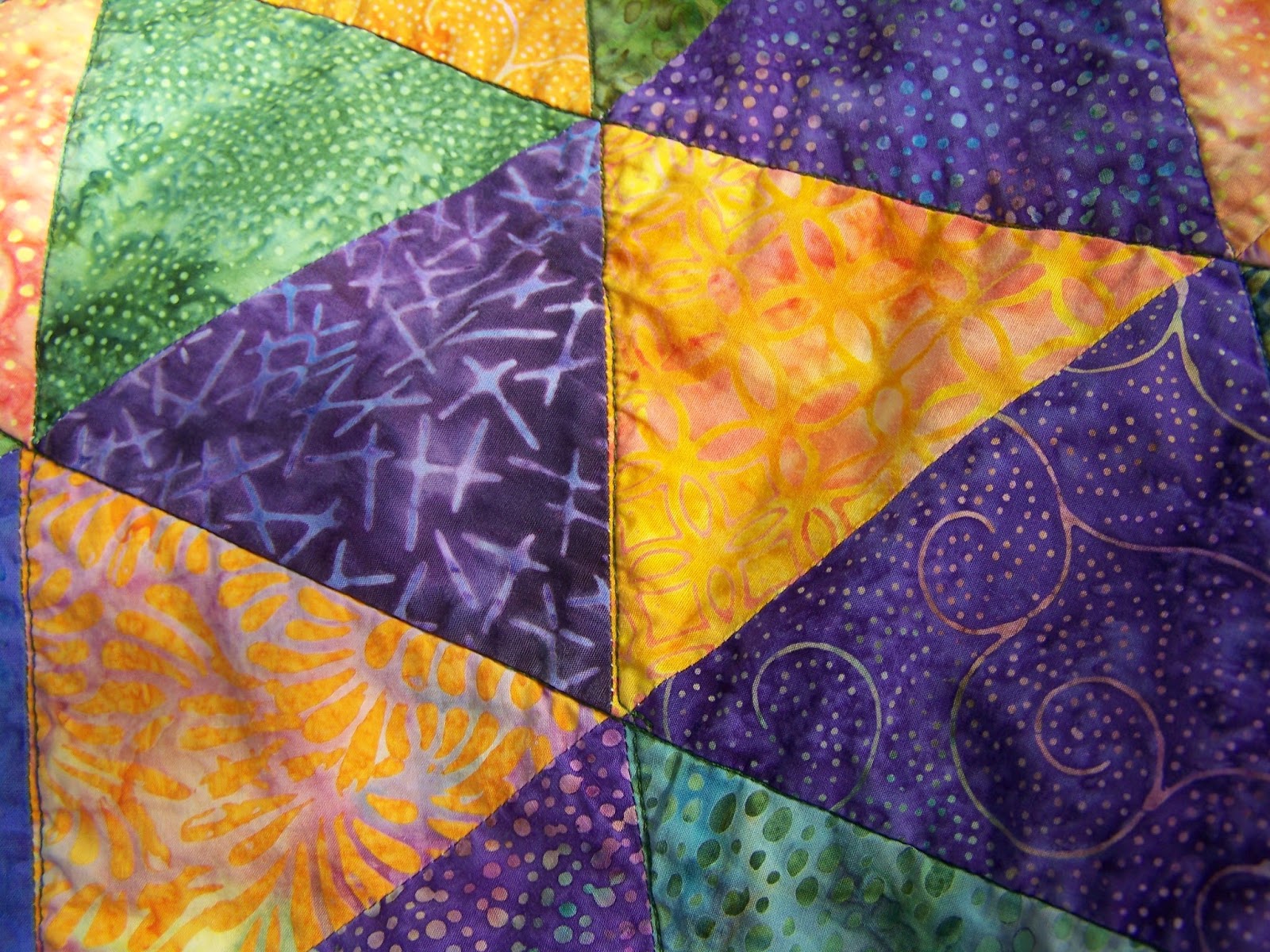 This was the second quilt . I made it to give to her when she left for university, about 7 years ago. At the time I belonged to a batik fat quarters club. I got some orange and purple fabrics one month and asked if she would like a quilt made of these fabrics. She said yes and asked that I make the pattern that came with the fabrics. I believe it was called 10,000 pyramids.
