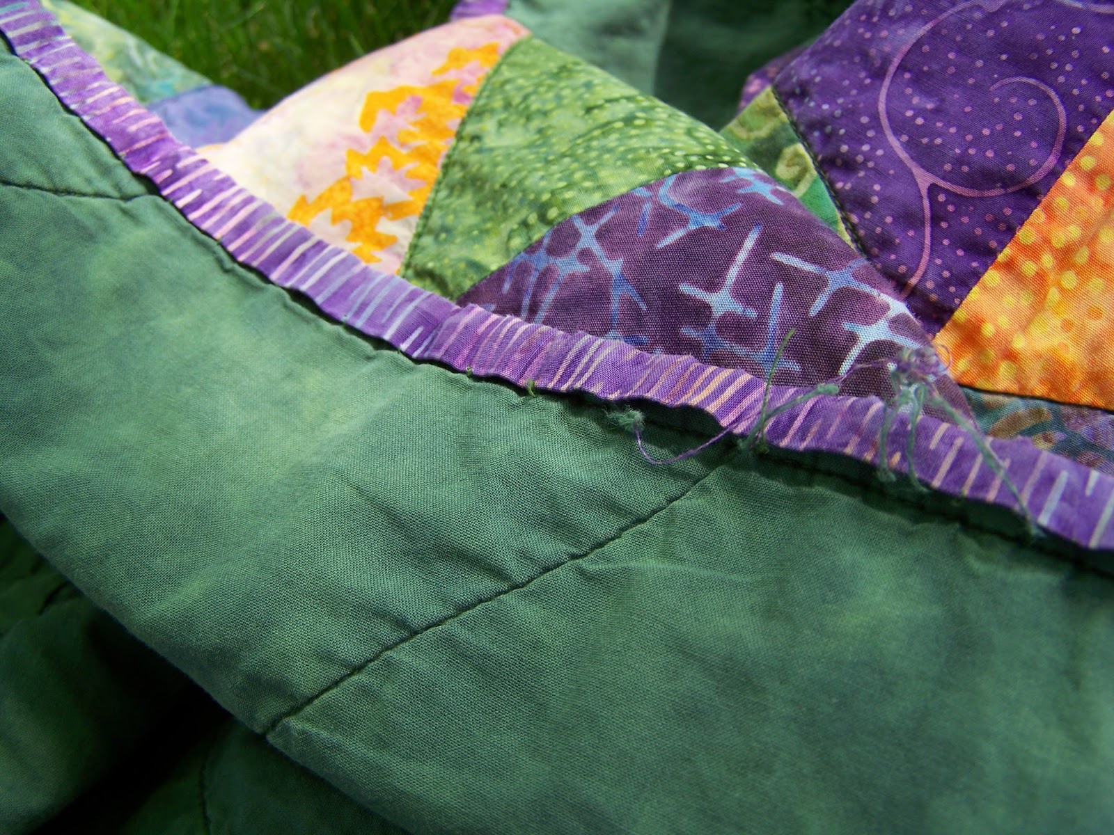 I quilted it in the ditch sort of. That had been suggested as the easiest way to quilt but to be honest I think quilting the width of your walking foot away from the ditch is easier and looks better. Here's a close up of the quilting, not quite in the ditch, but not all that noticeable with these fabrics.