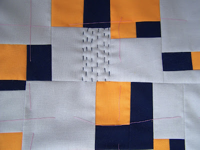 My original intention was to quilt it with big stitch quilting with navy and orange thread,but once I started I was unhappy with the result.