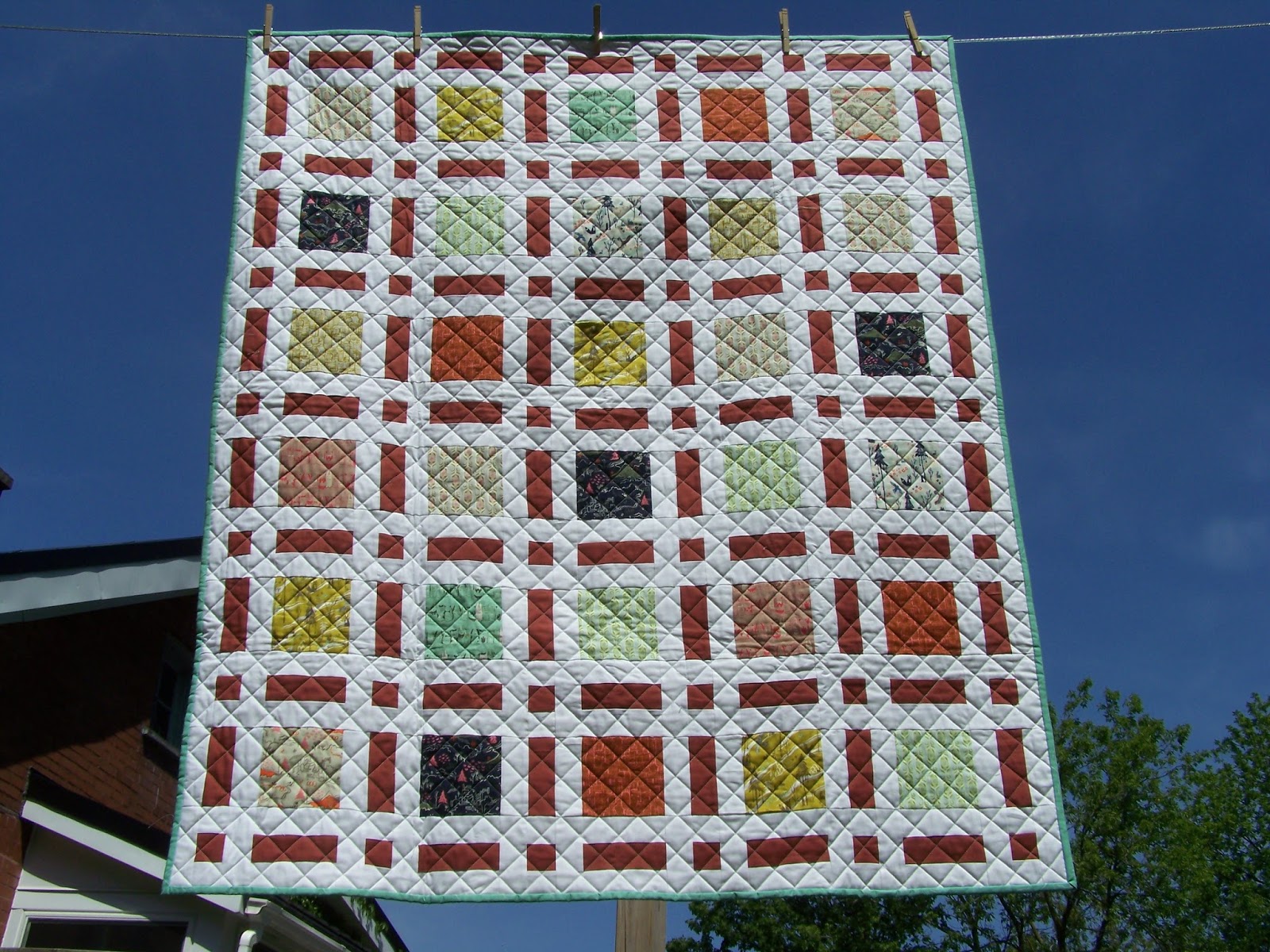 The quilting on this one was straight lines quilted diagonally across the quilt, also done on a long arm. I think it's very effective.